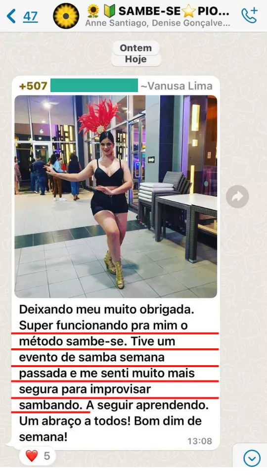 Ao longo da minha jornada, guiei milhares de mulheres reais e comuns, assim como você, a sambar com Desenvoltura e Confiança, começando do zero e ativando sua potência feminina.